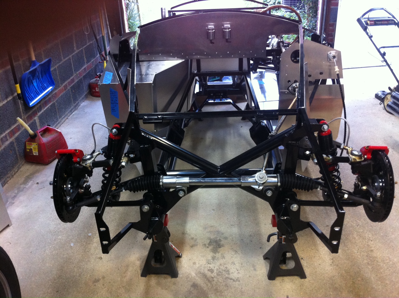 Lastly, I thought my front wheels (rotors) were toe'd outward too much. The only way to really fix that was to take off the steering tie rod and screw it in further. This is a little time consuming but gave me the chance to access the grease nipple on the tie rod end to put grease in there which I didn't do before initially installing. Tip for getting the tie rod off- loosen the bracket it attaches to from the spindle, then use both a hammer and a rubber mallet by hitting the bolt downward with the mallet and the bracket upward with the hammer simultaneously. It sounds crazy but if you do them both at the same time you really don't have to hit either one that hard. In this picture you can also see I temporarily mounted the steering wheel to check that the front flexible brake lines didn't get in the way of steering or suspension when turning the wheels lock to lock.